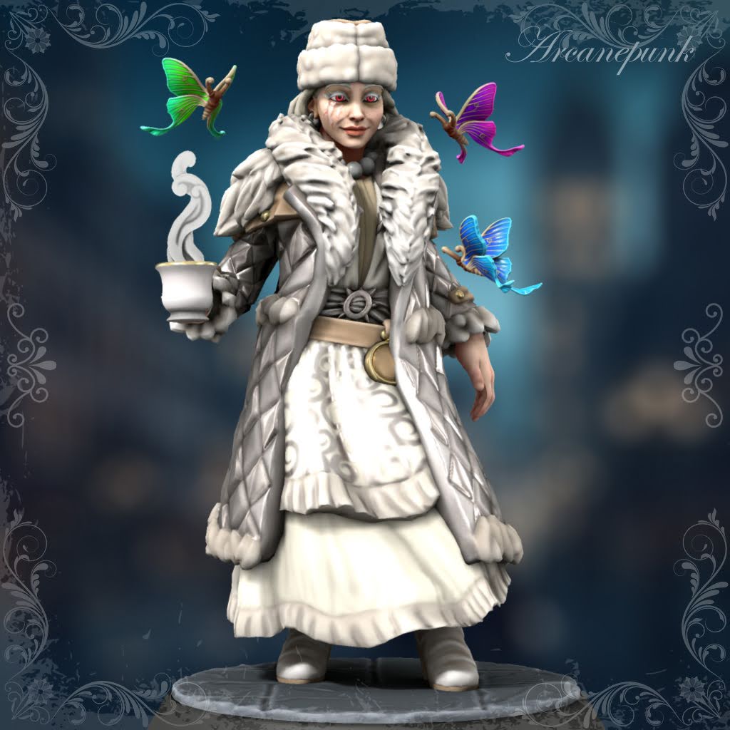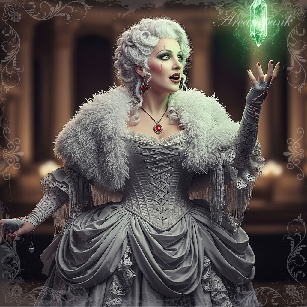 Alexiroe Meringeux, an incandescent icon of Edenlon, is an opera diva whose voice, a silken enchantment, can charm and captivate, spiriting her audience to the very heart of profound emotion. Her performances are not mere events; they are luminous spectacles, and she herself, the unchallenged star of every stage. To the adoring throngs, she appears as an ethereal beauty, robed in white furs and intricate garments, her eyes gleaming with an extraordinary radiance. Yet, the moment the final curtain falls, the instant she is able, Alexiroe flees to the sanctuary of her home, where Valentine de Truffle, a fearless explorer from the fabled Sea of a Thousand Islands, awaits her return. It is within this private sphere that her true drama unfolds: a relentless battle against the untamed power of the aether and its devastating toll on her fragile health. Even her brilliant stage life brings its own peculiar burdens, not least among them her persistent admirer, Sir George Alistair Pudding, whose naive yearning for “adventure” unwittingly attempts to ensnare her in perilous situations she, due to her delicate condition, vehemently wishes to avoid.