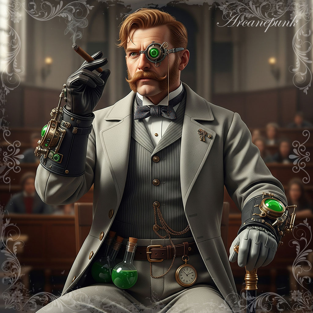 The most striking feature of his appearance is undoubtedly the aetheric ocular, a luminous, mechanical marvel that replaced the eye he lost in a calamitous experiment. This gleaming prosthetic not only stands as a testament to his innovative spirit but also imbues him with an almost inhuman aura, setting him apart from all others. It is rumored to possess specialized analytical capabilities, enabling him to see in darkness or perform intricate scans.