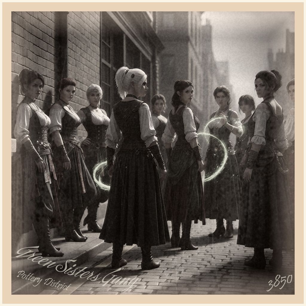 The Green Sisters are neither a typical gang nor a settled community. They are a mysterious, nomadic sisterhood, often equated with the Romani by Edenlon’s inhabitants. They move within the Potter and Temple District but claim no fixed territory, their presence ephemeral—appearing and disappearing as they drift between hidden alleys, forgotten temple ruins, and lush, wild gardens. Their roots trace back to ancient traditions of healing and mysticism, and it is believed they still venerate the Old Gods, an overt heresy in atheistic Fergeria. Edenlon’s citizens often label them as witches, fearing their purported powers and arcane rituals. While any analytical mind would dismiss such claims, rumors wield immense power, and the Green Sisters do little to dispel them, seemingly benefiting from the mystique. This sisterhood is ruled exclusively by women, true sisters not necessarily by blood, but by a profound bond, shared ideology, and mutual support. Their hierarchy is informal, built upon wisdom and seniority. Whispers abound of the Green Sisters possessing extraordinary abilities. Some are said to manipulate aether in ways incomprehensible to others, employing it for healing and to craft unique objects that defy mechanical logic. This is particularly significant given that green is also the color of aether, further amplifying their mystical image and alleged connection to this potent energy. Their ultimate aim is to achieve harmony with nature and to spiritually cleanse Fergeria of its “technological plague” and corruption. Their methods are often radical, their actions aimed at protecting ancient aetheric energy pathways and sacred sites from a corrupted civilization.